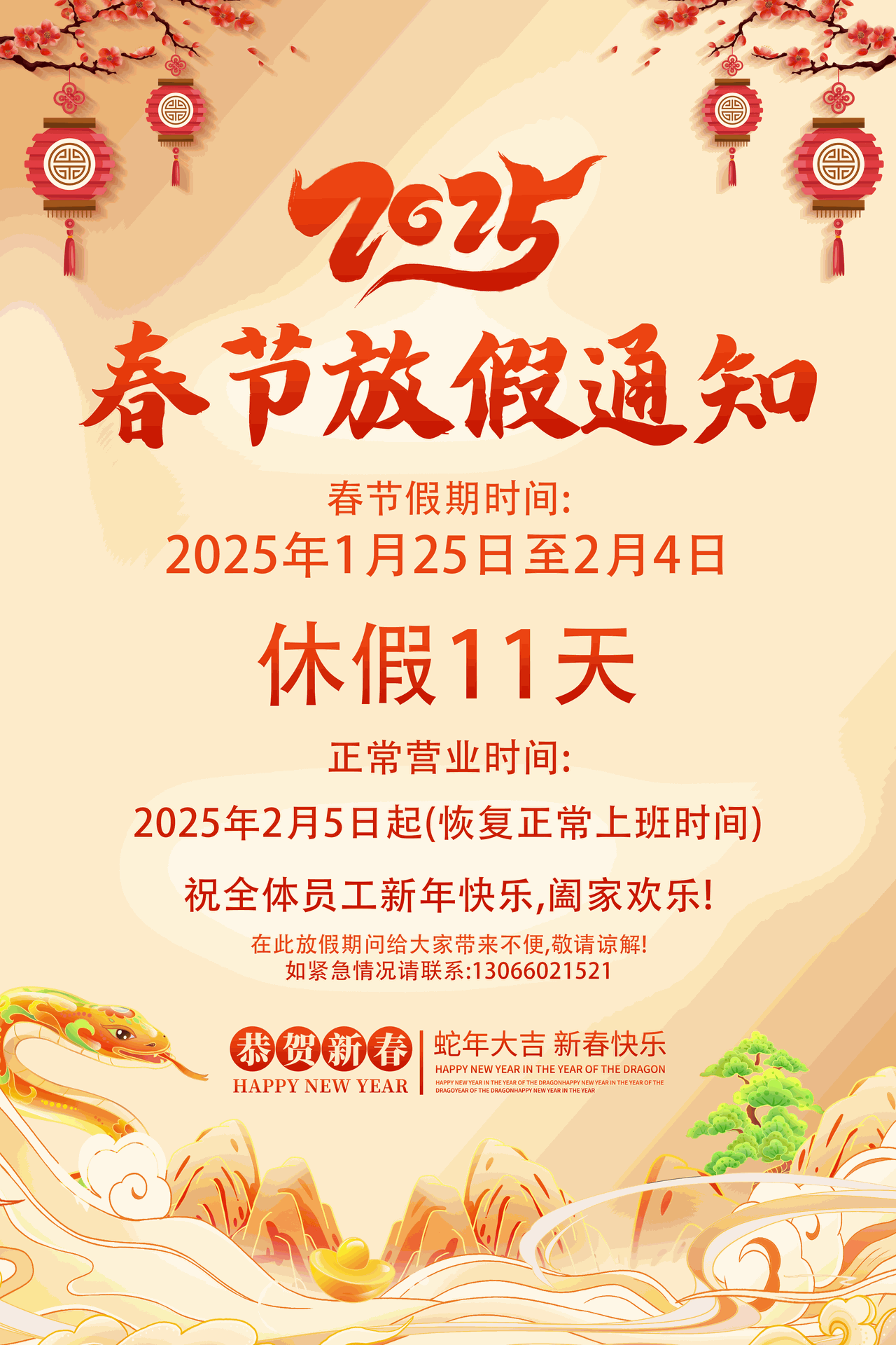 根据公司安排,我司将于2025年1月25日(腊月初六)至2025年2月5日(正月初七)放假,2月6日(正月初八)正式上班。在此期间,如有紧急事务需要处理,请联系相关负责人。