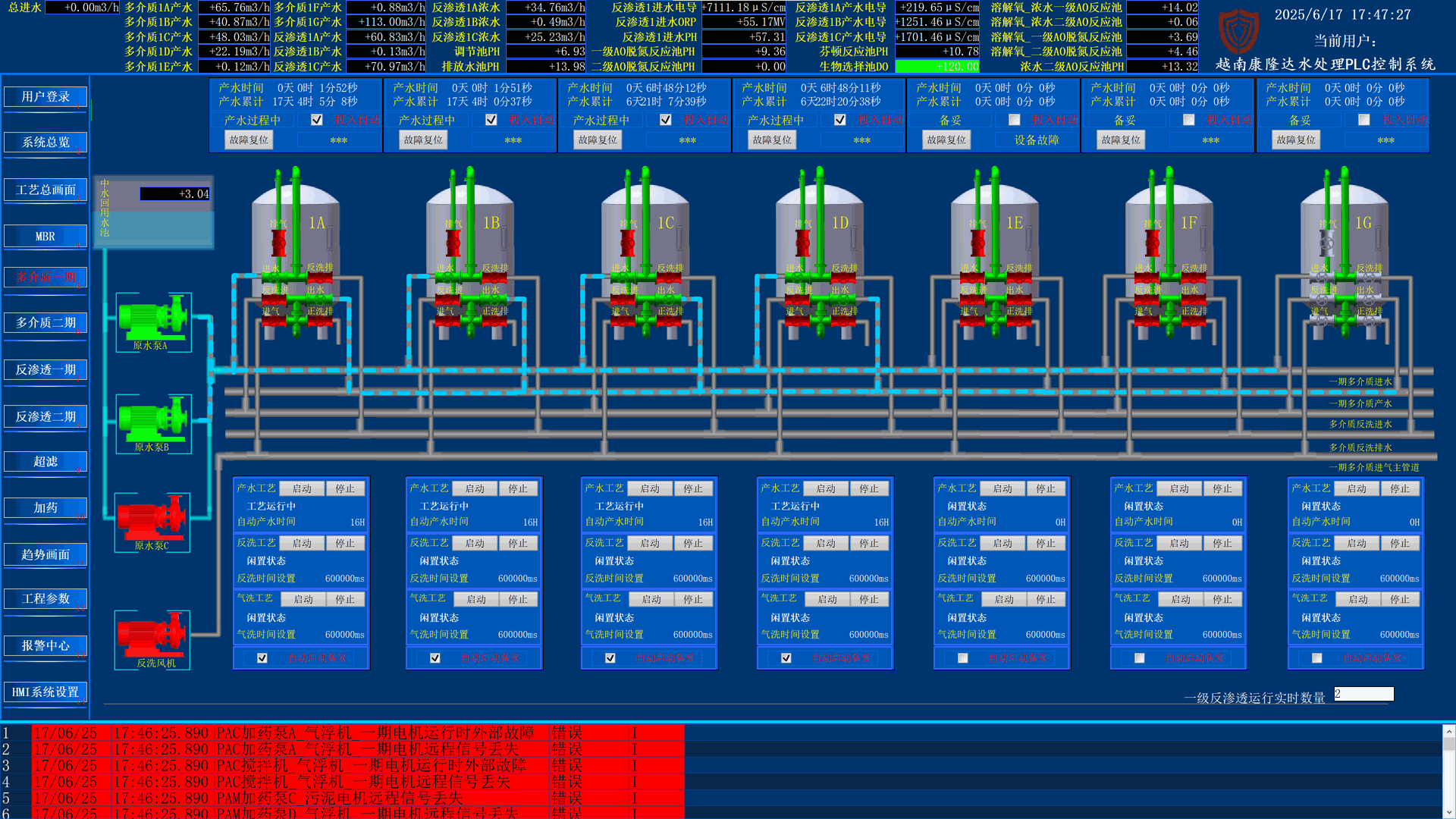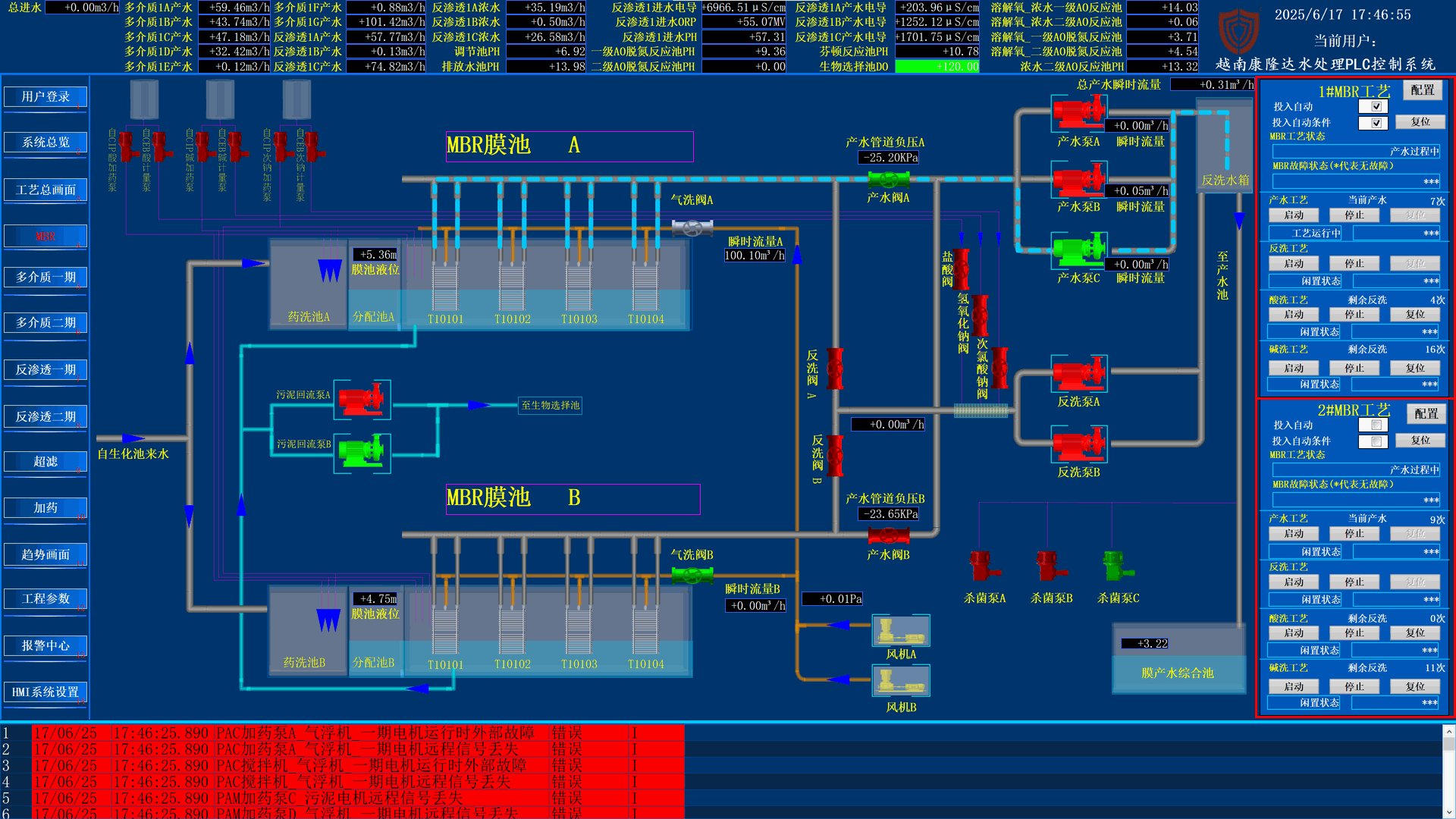 本项目PLC自控系统由我司独立设计、开发、调试与维护,覆盖污水进出水流程、加药系统、膜反洗控制、泵组联动控制、故障报警等全部环节。